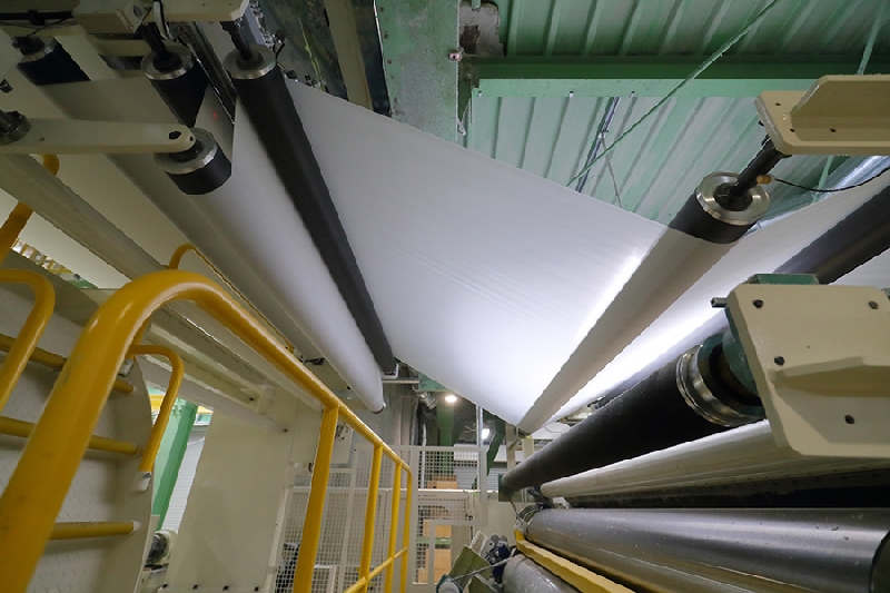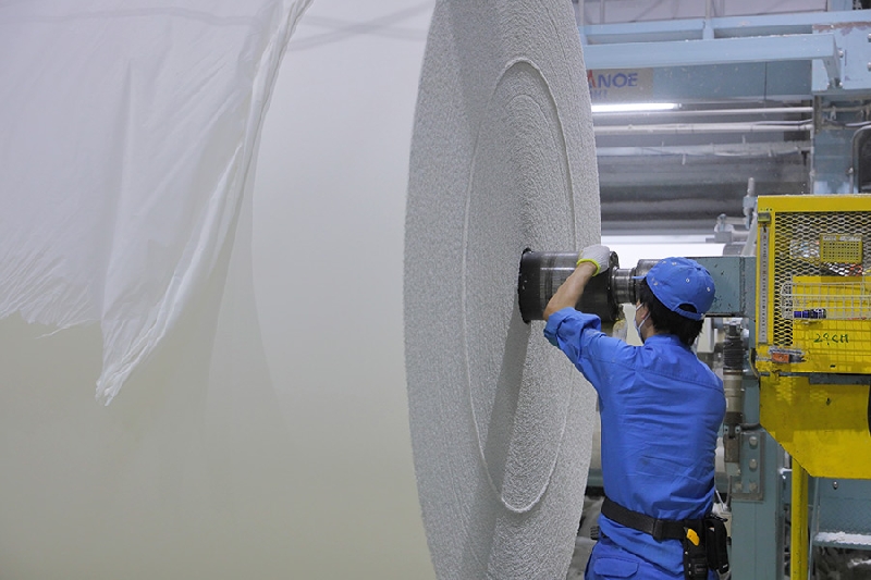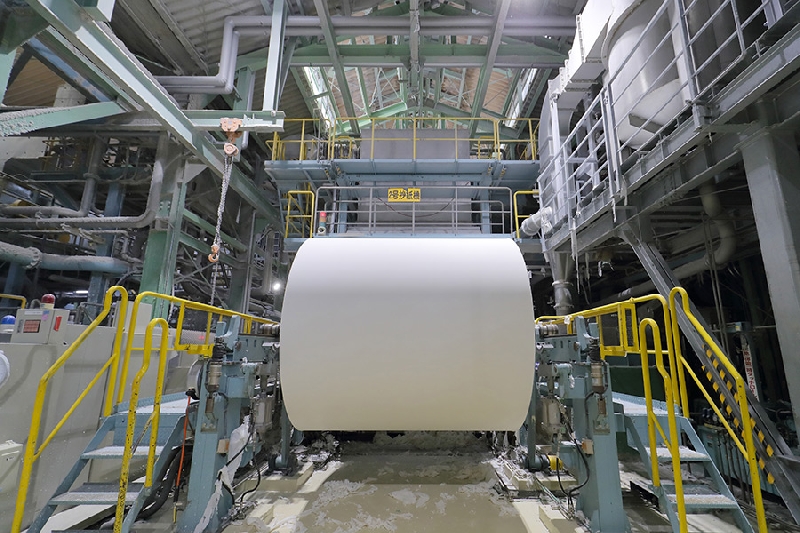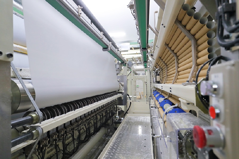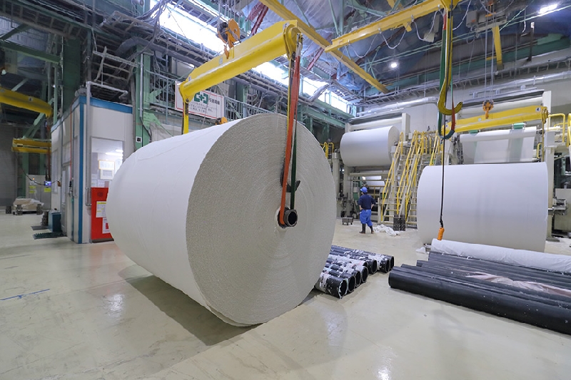 ドライヤーで瞬時に乾燥させ巻き取り、紙を製造します。約2.5tの重量、長さ約5〜6万mの大きなロールになっていきます。